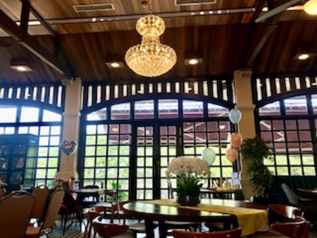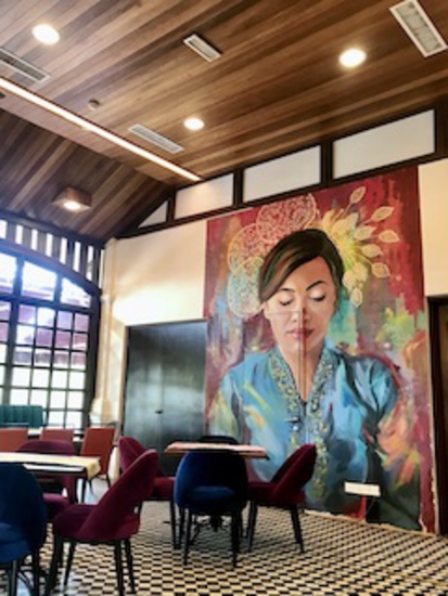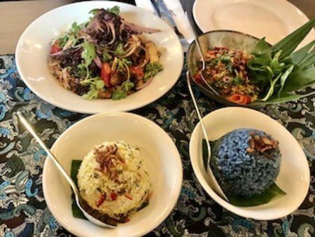 店内は広々として南国の雰囲気いっぱい、ベランタからは向かいの海沿いの公園が見えます。お料理は野菜やお米がバランスよく取り入れられていて、青いご飯を楽しめました。英語ではバタフライピーと呼ばれる花の汁で炊き上げる、私の好きな一品です。野菜もエビも美味しく頂きました。