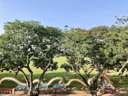 食後にはお向かいの公園散歩。以前、日中に訪れて、暑くて暑くて二度と足を運ばなかったエリアでしたが、夕暮れ時は涼しく、家族連れが週末の夜をノンビリ過ごしていました。