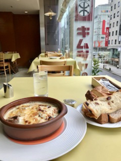 彼女は今はフリーの美容師さんで、結婚して出産後も元気に銀座で働いてます。予約より早めに東銀座に到着、四月歌舞伎座の演目を眺めてから、ひとりランチを木村屋さんで。コロナ前は、いつも一階のパン売り場からレストランまでお客さんたくさんだったけど、今は、案の定ひっそりで、正午前のレストランでは窓側の良い席に案内されました。お目当ては「食べ放題のパン」。グラタンと満腹になるまで美味しく頂きました。