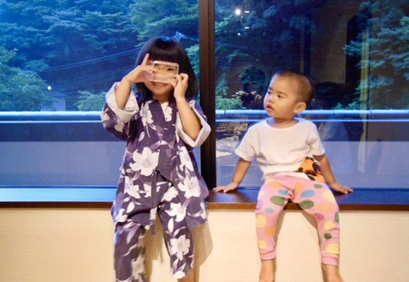 下の写真は8年前のやつ、この時は私たち総勢9名でこの温泉へ。今年は同じ宿へ、8年後の写真の2人+子分1人、パパとママの5人で訪れたらしい。