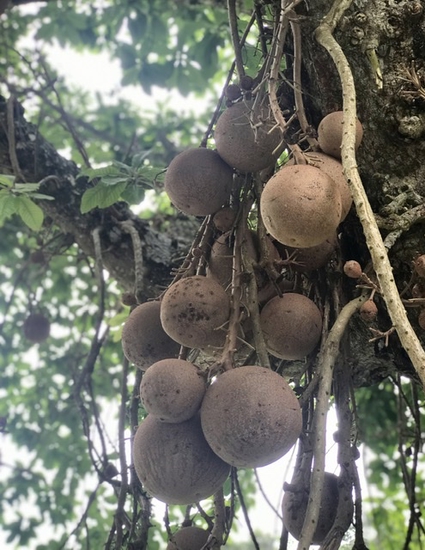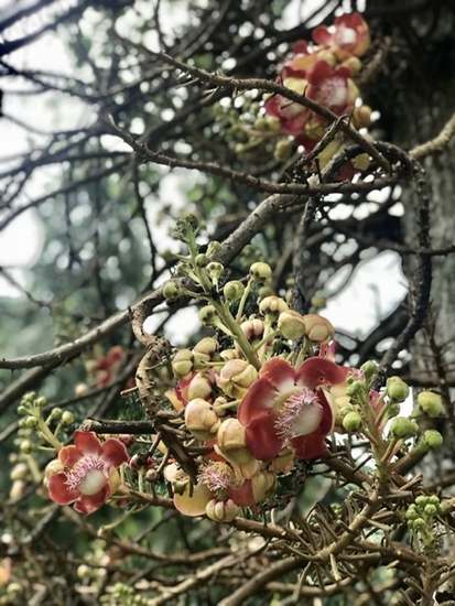 公園入り口に何本も並ぶ不思議な老大木、花も独特