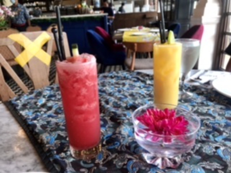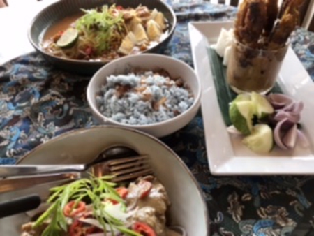 まずはウォーターメロンジュースとマンゴジュース。マッシュルームシープ、ラム肉料理、サテと言う焼き鳥のような鶏肉、ミールブスと言われるヌードルスープ、バタフライピーを使った青い色のご飯・・お腹いっぱい。