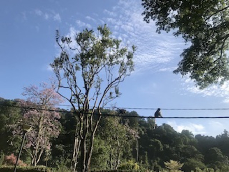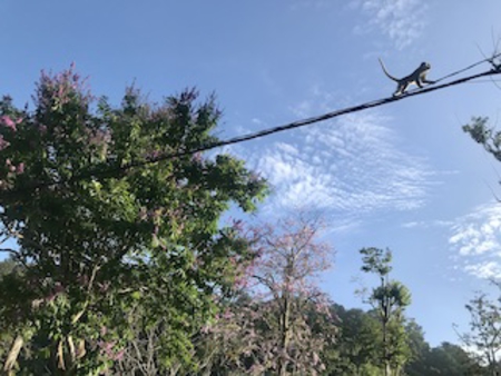 入り口に向かう途中、上を見ると猿さんたちが電線ノッソリノッソリ。