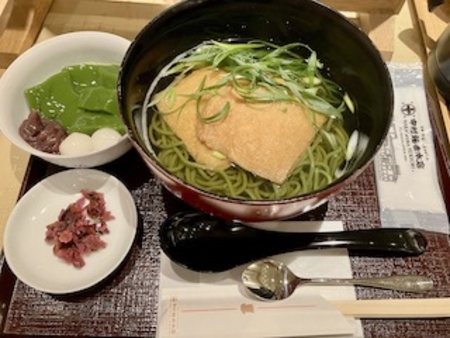 開店前に行ったら、女性客が並んでいて、相変わらずの人気です。抹茶きつねうどんのセットには抹茶ゼリィがついていて、さらに薄茶を注文するという、抹茶づくし。