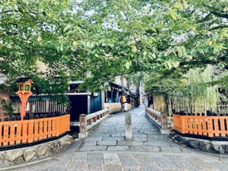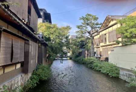 鴨川を渡り横道にそれて暫く歩くと、小川のほとりに佇む甘味処、なんと行列の「ぎをん小森」です。列に並びながら周囲の景色をうっとり眺める。小道、水路、木々の緑、古い店構え・・近代化と合理化が進む時代に、この美しい街並みを保つのは、どれほど大変だったろうか。