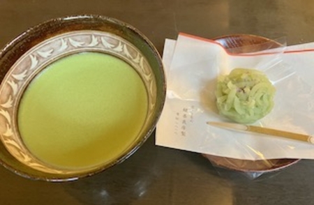 四条通に面した鍵善良房は立派な店構え、店内はモダンです。今回は私が抹茶セット、連れ合いが葛切り注文、さすがに連れ合いは「くずきりの甘さ」に半ばでギブアップ。私が残りを美味しくいただきました。葛切り・・東京のどこかで頂いたような。葛切りと黒蜜に懐かしさを覚えました。こちらの器はまた独特です。お抹茶といい、和菓子といい、わらび餅といい、葛切りといい、京都の甘いものはホント美味。