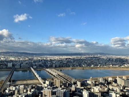 あべのハルカスに比べると低いビルだけど、その分、淀川や大阪の街が間近に見えます。あと回廊のようになった外を歩けるのは圧巻。一時曇っていた冬の空が、再び晴れて来て空中散歩日和になりました。何とくなく宇宙と交信?した雰囲気を味わってから、梅田駅へ戻り御堂筋のライトアップを眺めにGO!