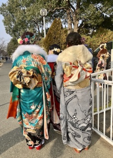 成人式の晴れ着姿、何年ぶりだろう。自宅の裏のさくら公園では、母上が娘さんの着物姿を写真撮影していたり、中学校の校門前には華やかなグループが集まっていたり。