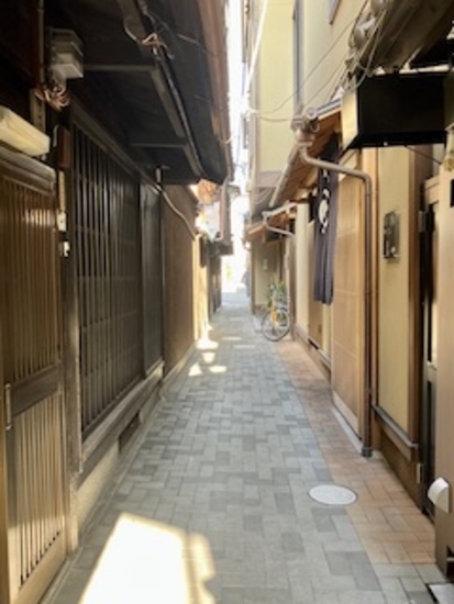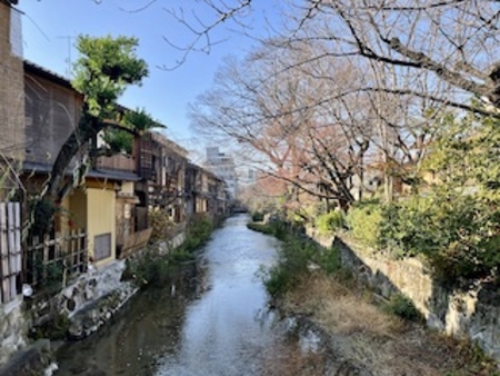 路地に水路、家並み独特の京の町は、いつ歩いても絵になります。ふと、小さな子連れの着物姿の親子に気付く。なんと会話は中国語。バギーの中の子供も両親も和服で何とも可愛い。どの国から来た中国人か分からないけど、いいですね。