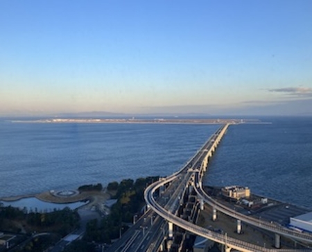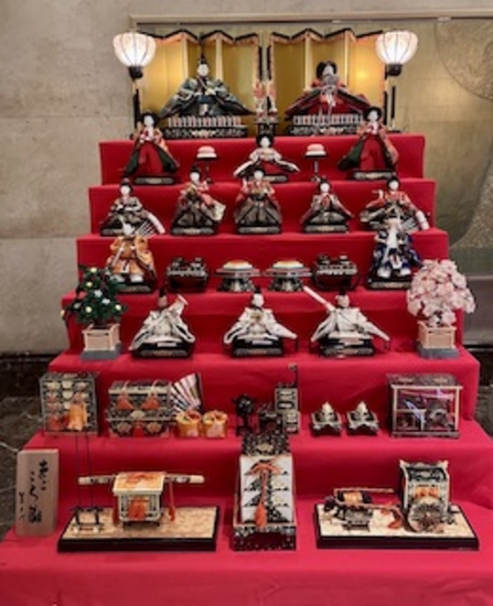 写真はホテルから眺める大阪湾とロビーに飾ってあったお雛様です。