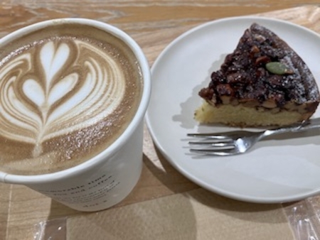 満足したあと、夕暮れまで近くのカフェで雨宿りです。こちらのタルトとカフェラテも美味でした。日本のコーヒーは苦手な私もすんなり飲めてたっぷり楽しめるカフェラテ、ナッツタルトも食べやすかった。