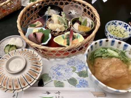 炭水化物食事制限中の連れ合いですが、久しぶりの外食なので、今日は「きつねうどん」と「ゆかりごはん」が付いた四季弁当にしました。華やかな色合いでボリュームいっぱいのランチ、美味でした。
