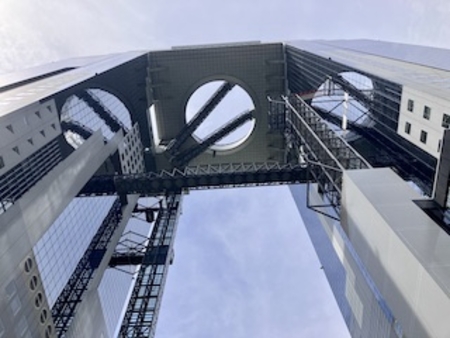 暑さにもめげず大阪の人たちは外出好き?、デパートには多くの人たちがいてレストラン街も順番待ち。美味しいきつねうどんにありつけて幸せなり。食後は空中庭園を案内しようかな、と梅田スカイビルへ。