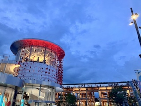 そろそろ帰りのバスに間に合うように、と西ゲート近くのショップ(20:00近くなって行列なく入れました)へ、バッタリ三女たちにお店の中で出会って「うわー!」。万博グッズもこれが最後の買い物かな、と東京で差し上げるグッズをチョイスです。