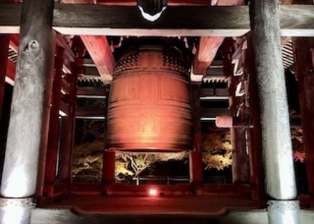 春のライトアップで訪れた大鐘楼を見に階段を上り、阿弥陀堂や納骨堂を眺め、穏やかな静かな気持ちに。お坊さんの読経の声が響き厳かな雰囲気の中、お話が終わり2人がお堂から出てきました。