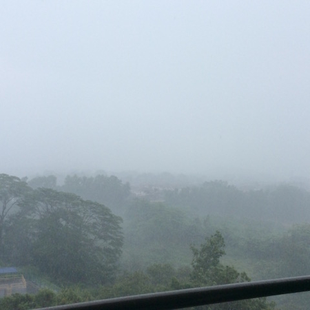 写真は、ベランダからの眺めで、晴天と雨天と。