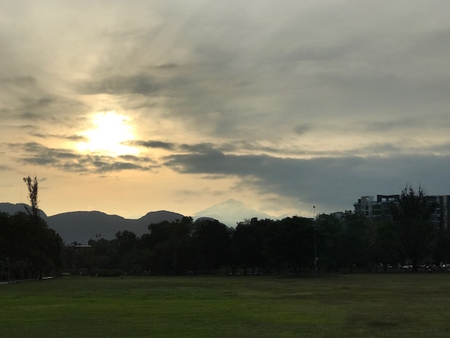 公園から望む、姿の綺麗な山が、珍しく雲に隠れてました。