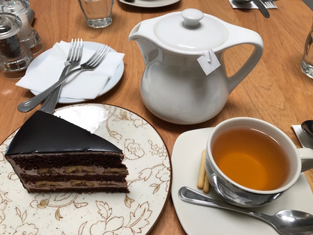 私はチョコケーキと紅茶、連れ合いはパンケーキと珈琲で、まずは一息。