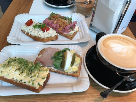 先ずは腹ごしらえ、評判良いショップで簡単にオープンサンドとカフェラテ。