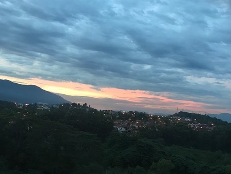 夕食時、ベランダから見える夕暮れの美しい景色が、