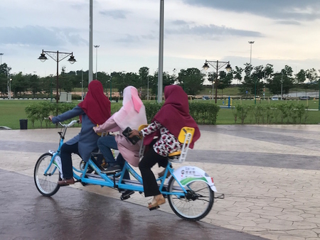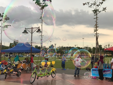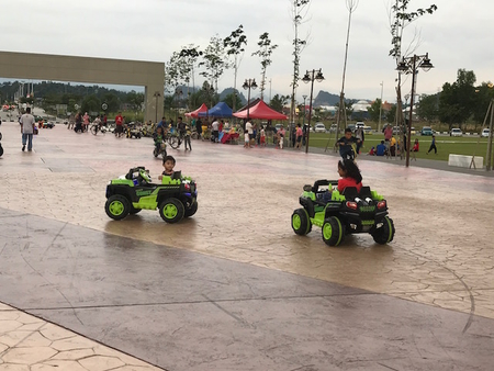 自転車や子供たちの車が運び込まれて、家族連れが遊んでます。