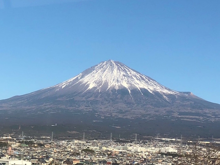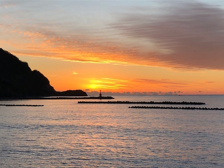 御来光、富士山、伊豆の海辺の夕空・・