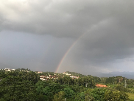 夕方、30分ほど激しい雨が続いた後、ベランダから「虹の架け橋」が綺麗に見えました。