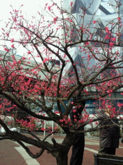 茅場町のビル街で、仕事帰りに眺めた紅梅。
