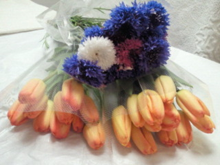 オレンジ色のチューリップを2束、矢車草の花束を1束。