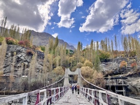 吊り橋をゆっくり渡る。岩山に囲まれた村へ行く道なのか、川のところどころに吊り橋があって、人も車も渡っていく。海外ツアーでお目にかかる吊り橋。今の私の暮らしからは想像できない橋、そして周囲の景色。