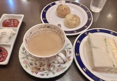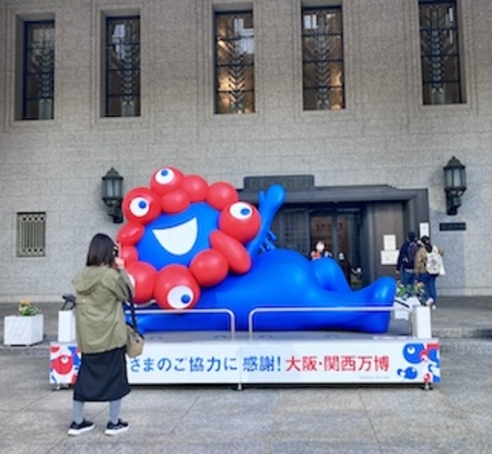 カフェは「ロンドンティールーム堂島本店」。名前通り店内はイギリス風インテリア、平日でもお客さんはいっぱいで人気店かな。帰り途中に市役所のミャクミャク様にご挨拶。