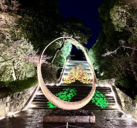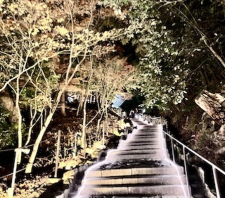 春のライトアップで訪れた大鐘楼を見に階段を上り、阿弥陀堂や納骨堂を眺め、穏やかな静かな気持ちに。お坊さんの読経の声が響き厳かな雰囲気の中、お話が終わり2人がお堂から出てきました。