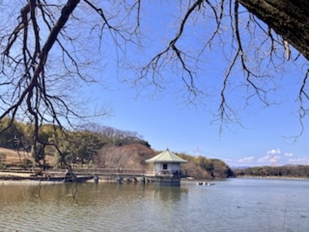 山田池公園の池の傍で手作り弁当のオニギリ頂きます。池の眺めは穏やかで、近くのベンチではワンちゃんたちが戯れ、持参したテントの中で寛ぐ子連れ家族たちも気持ちよさそう。