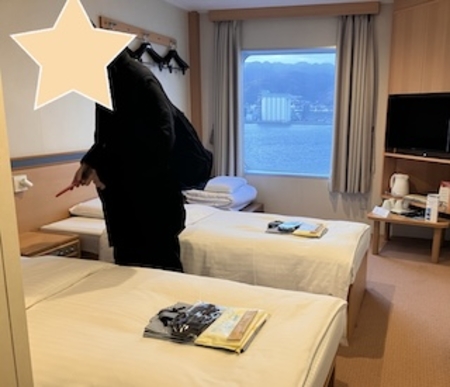 私たちの船室は広くはないけど使いやすく、窓から外が見れるのは嬉しい♡ 船内は全体的に設備よく整っていてレストランや大浴場もあり、10:00消灯までゆっくり心地よく過ごしました。