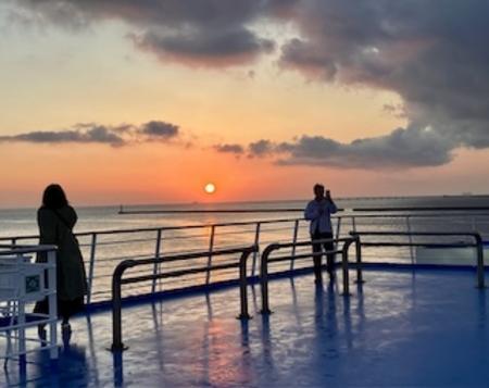 7:00には船旅が終わるので、日の出の写真を撮りに夜明け前に甲板へ。夜間に通した瀬戸大橋を見たくてデッキに出ようとしたけど、夜は風が冷たくて寒くて断念。早朝は気温も穏やかで景色美しく、しばらくデッキの上で時間を過ごしました。