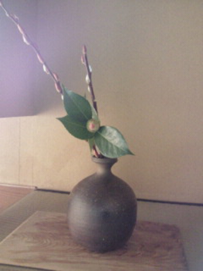 先生が持って来られた茶花「赤芽柳」と「妙蓮寺椿」が