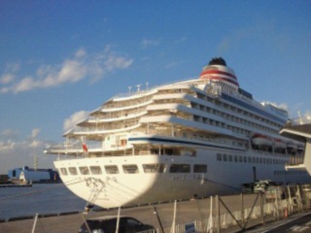 停泊中の「飛鳥」を眺め、横浜港の空気をいっぱい吸って、