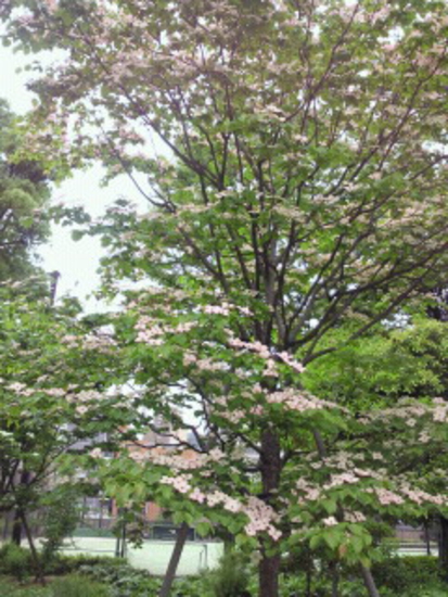 浜町公園でハナミズキの花咲く木を目にして、思わず携帯でパチリ。