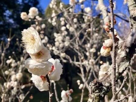 自宅からはバスを乗り継いで公園へ。3回目かな・・梅林を訪れるのは2回目。入り口から数10分ほど木々の間を歩いていると梅の花々が見えてきます。