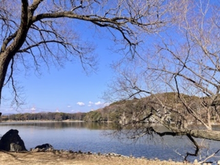 山田池公園の池の傍で手作り弁当のオニギリ頂きます。池の眺めは穏やかで、近くのベンチではワンちゃんたちが戯れ、持参したテントの中で寛ぐ子連れ家族たちも気持ちよさそう。