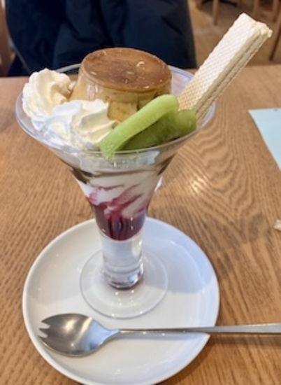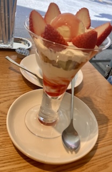 駅周辺で買い物してパフェで休憩。長女はストロベリーパフェで、私はプディンパフェ・・苺や冷いデザートが美味しい季節になりました♡