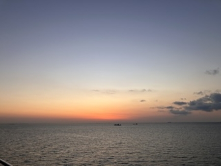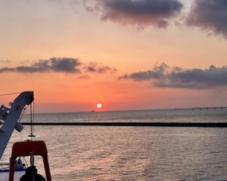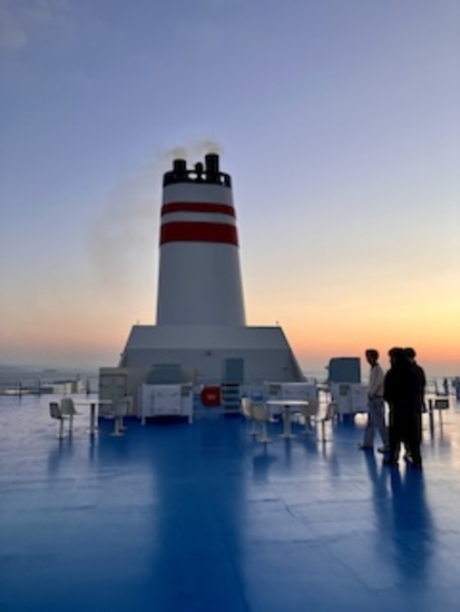 7:00には船旅が終わるので、日の出の写真を撮りに夜明け前に甲板へ。夜間に通した瀬戸大橋を見たくてデッキに出ようとしたけど、夜は風が冷たくて寒くて断念。早朝は気温も穏やかで景色美しく、しばらくデッキの上で時間を過ごしました。